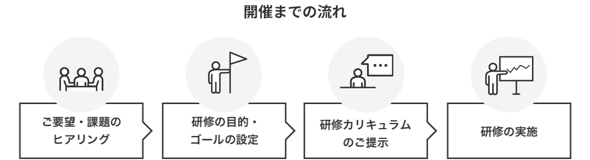 貴社の業務内容や現場の課題を丁寧にヒアリングし、 受講者の納得感・即戦力化につながる研修をご提供します。