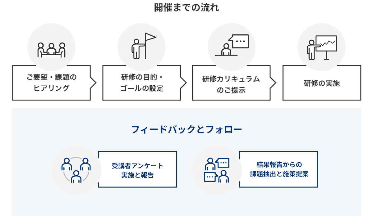 ピンポイントの研修の実施にとどまらず、必要に応じて学びの定着化や実践を見据えたフォローアップ研修や定着化支援のプランのご提案を行います。企業の人材育成戦略として、継続的なご支援を大切にしています。