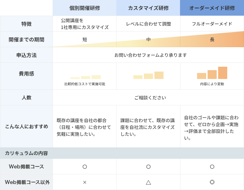 アイ・ラーニングでは、企業ごとの人材育成ニーズに柔軟に対応するため、①個別開催研修 ②カスタマイズ研修 ③オーダーメイド研修 全3種類のプライベート研修をご用意しています。