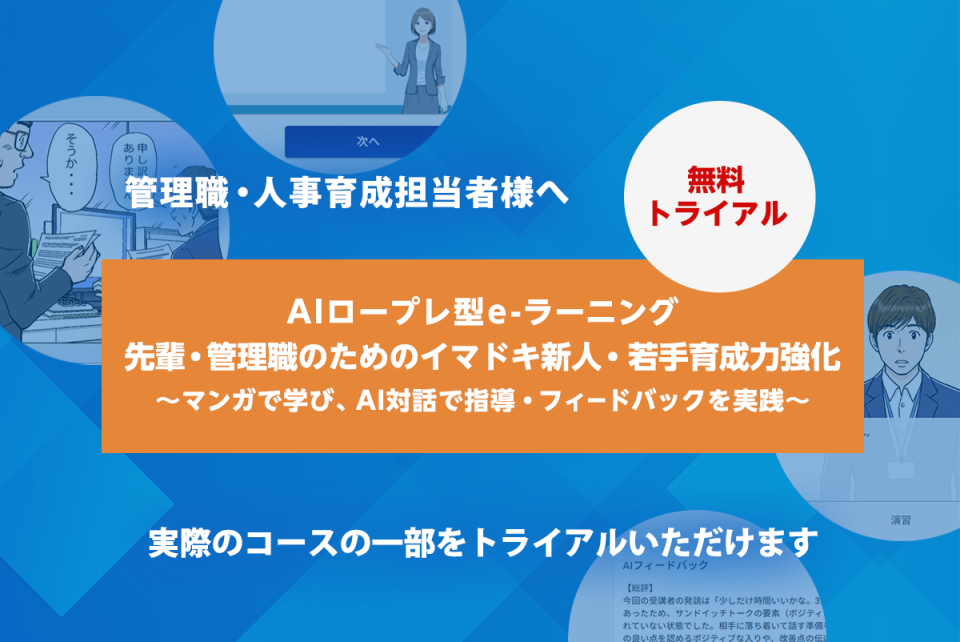 『先輩・管理職のためのイマドキ新人・若手育成力強化~マンガで学び、AI対話で指導・フィードバックを実践~』の一部テーマをご体験いただくことで、研修計画にお役立ていただくためのものです。