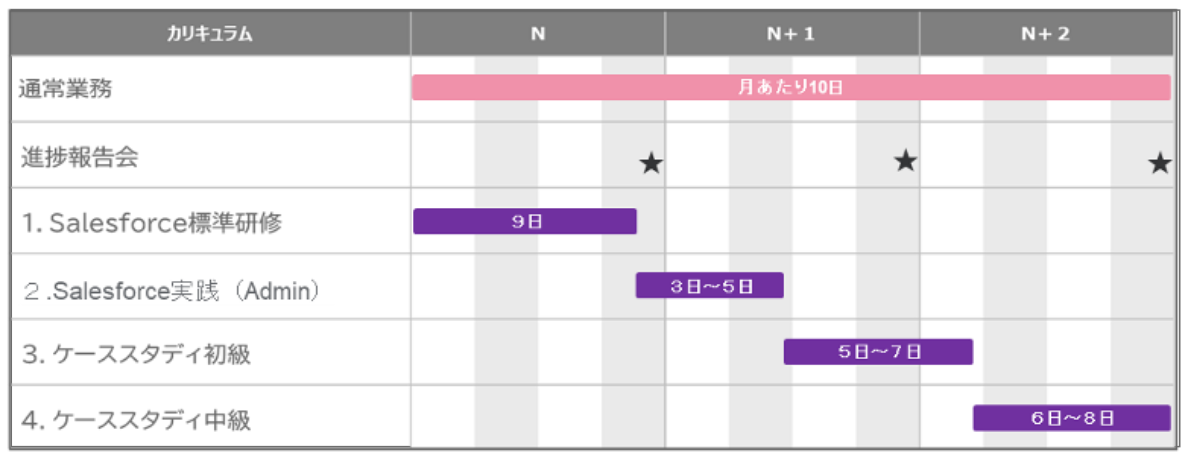 研修期間中にSalesforceの実務レベルまでスキルを習得することを目的とした育成プログラムです。
