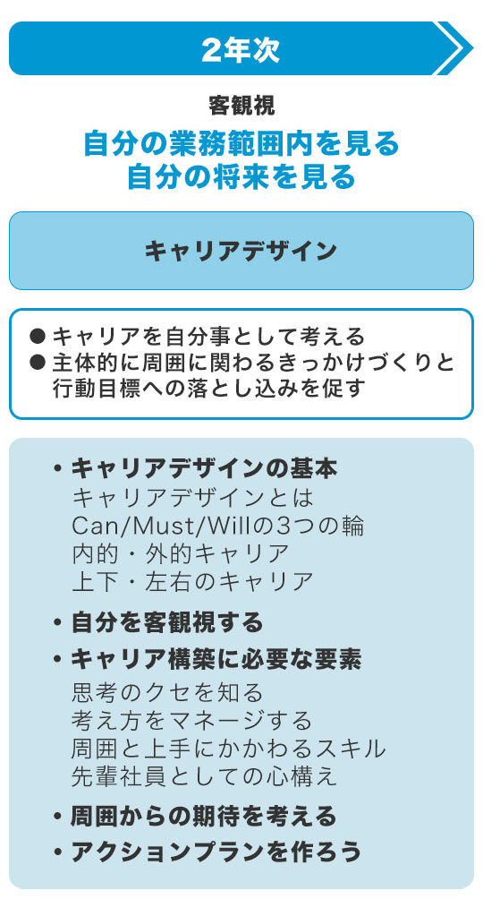 業務をよく理解してきたからこそ、忙しい先輩に声をかけづらい、自分だけで何とか解決しなくてはと、自分自身を追い込んでしまうことがあります。一方でまだまだ自分の業務視点にとどまることも多く、今後のキャリアもどこか指示を待つような人も見受けられます。