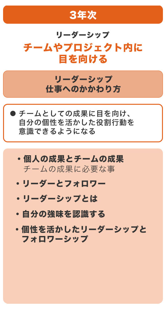 今までよりも広い視野をもって取り組めるよう、どのような視座を持ち取り組んでいくことが必要なのかを自身が認識し、その解決策を知っておくことが、困難な場面における手助けになります。自ら考え行動し、成長していくために、リーダーシップは重要です。ともすると自己流になりがちなリーダーシップですが、個性を活かしたリーダーシップや周囲とのかかわり方を学習するのに最適なタイミングが3年目だと考えます。