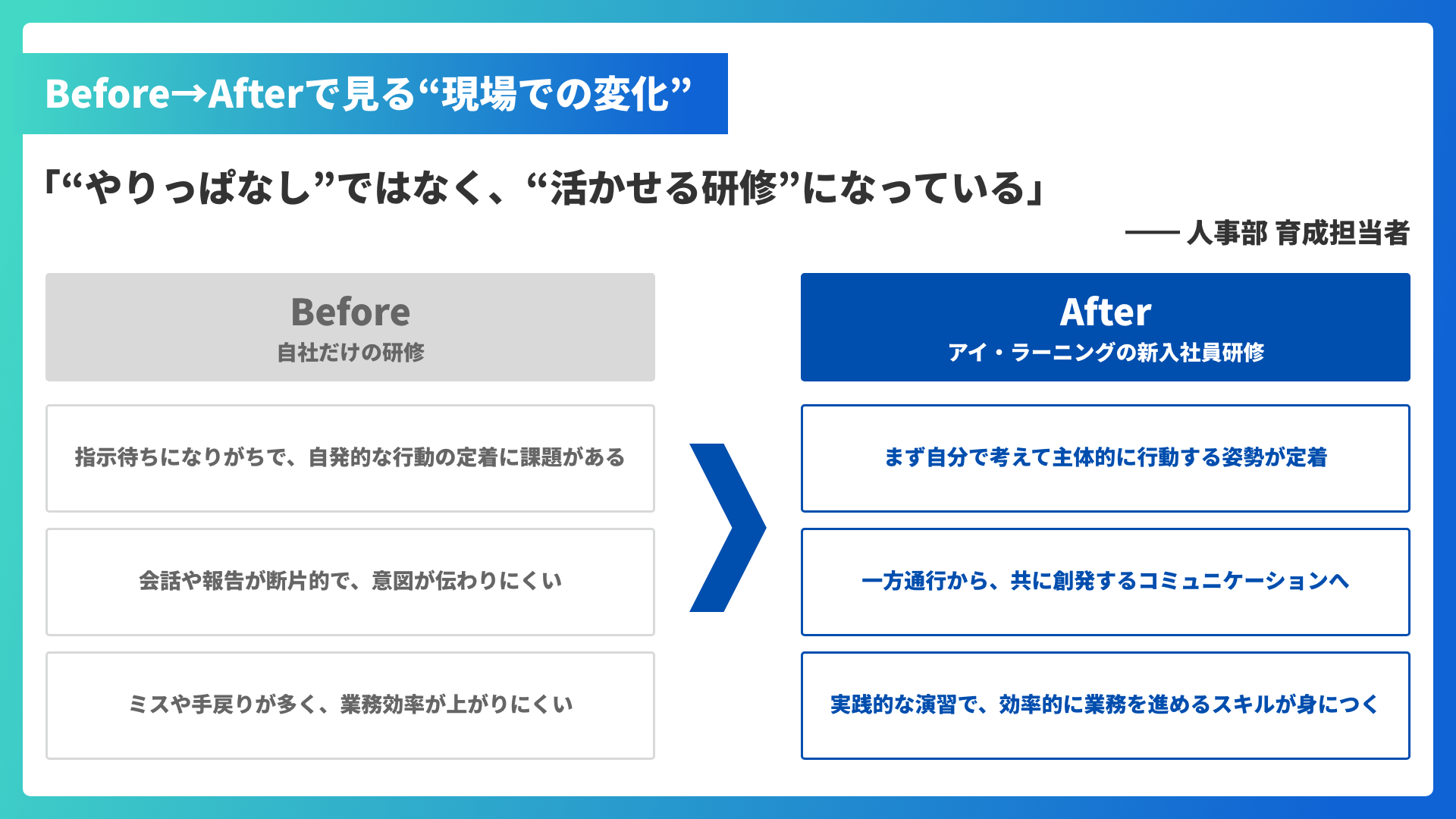 その”属人化”を解消するのが、アイ・ラーニングの合同研修です。プロの設計で効率も効果も桁違いです。「自走できる新人」育成を全面サポートします。