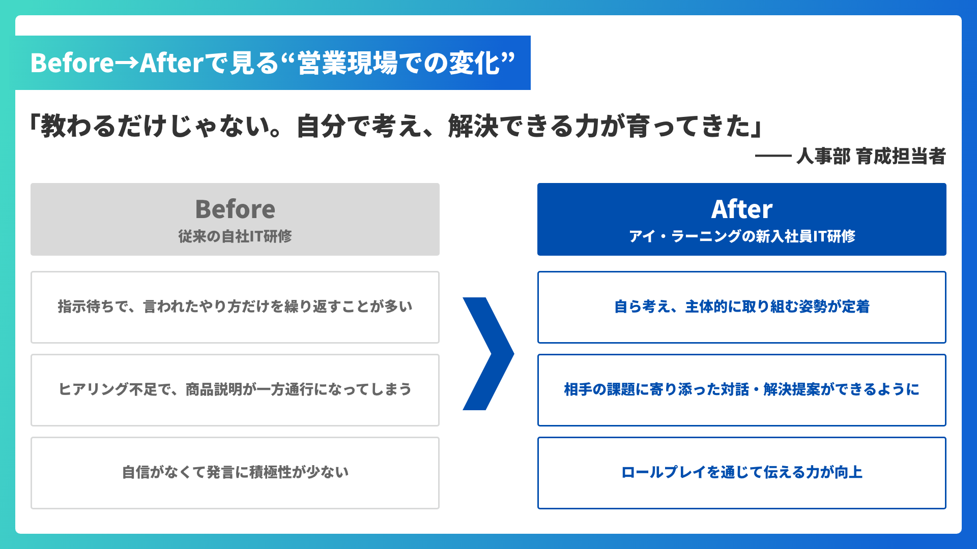 さらに、ロールプレイ後のアドバイスや個人別シートで、学びの定着と行動変容をサポート。営業の基礎から顧客視点のソリューション提案まで、一貫して実践力を磨くことができます。