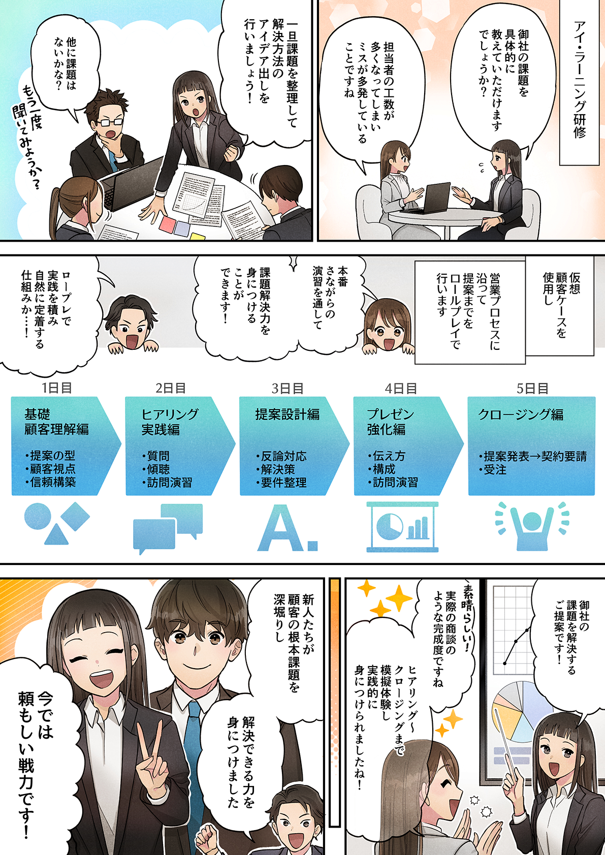 アイ・ラーニングの「ソリューション提案」シリーズは、ロールプレイで提案のプロセスを段階的に体験し、“教わる営業”から“考えて提案できる営業”へ成長を促します。