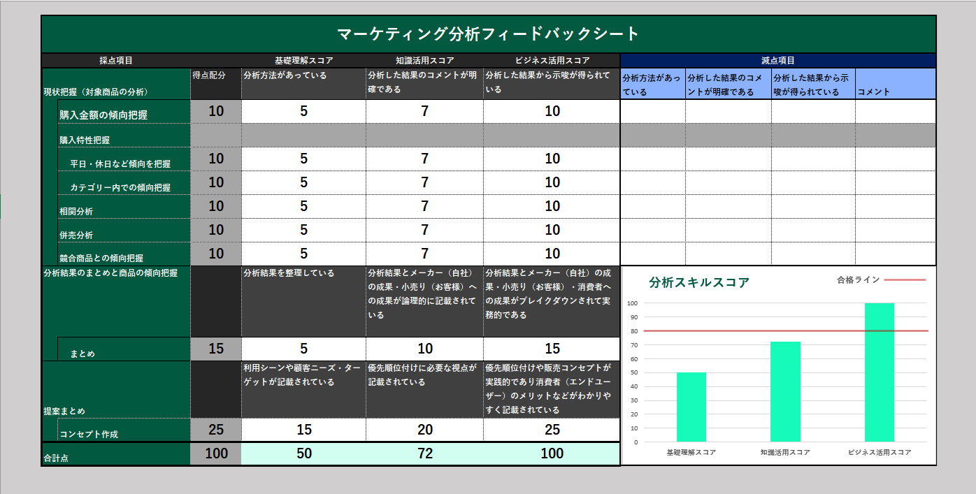 ■講義内で実践していただいた基礎分析、分析結果の考察、提案内容の作成に対して、スコア形式でフィードバックさせていただきます