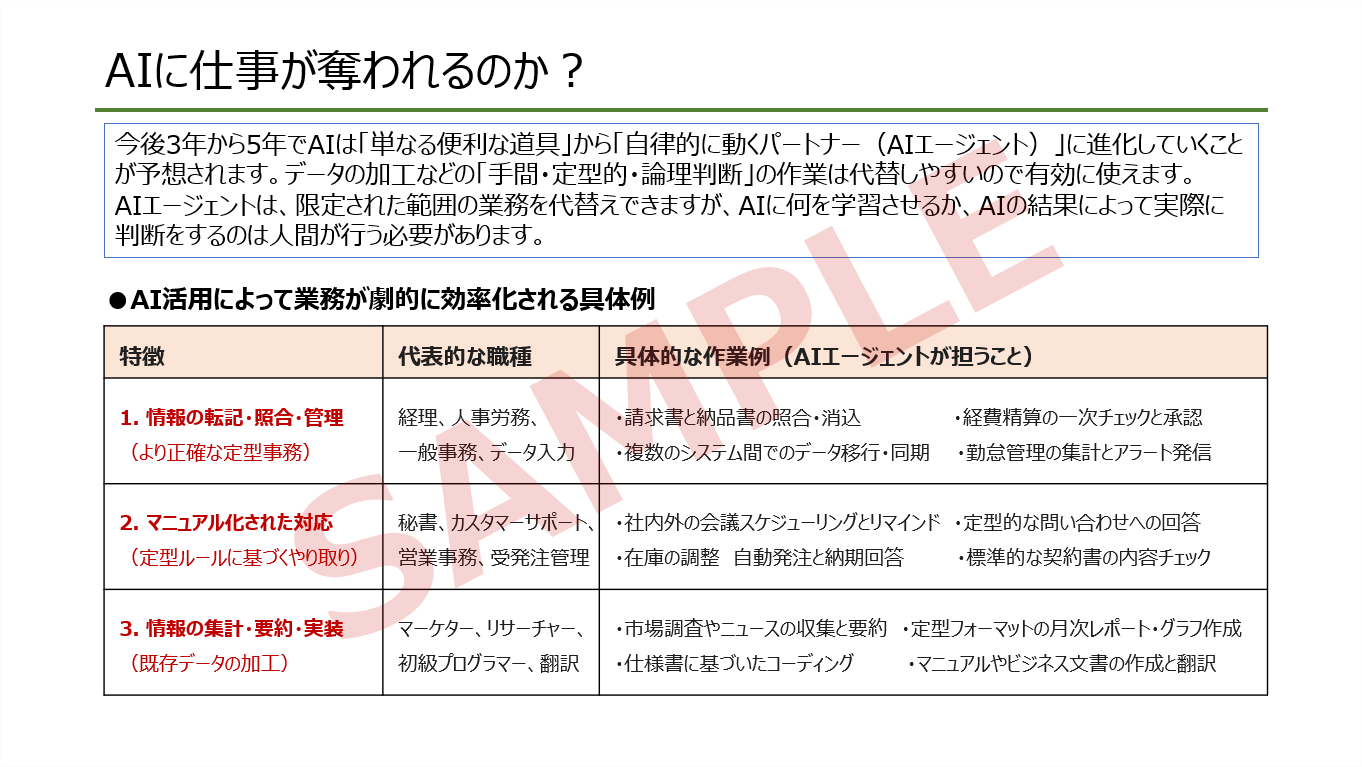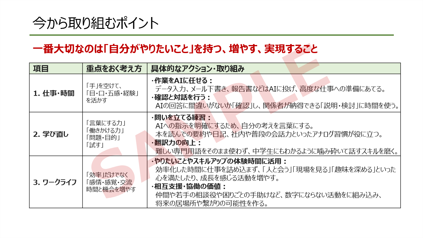 ・AI共生社会の変化を理解し、自身のキャリアへの影響を整理できる