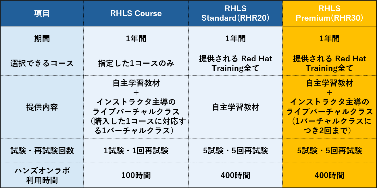 2026年1月より、全てのメニューは、Red Hat Learning Subscription (RHLS) 3種類でのご提供となります。いずれも期間は1年間です。