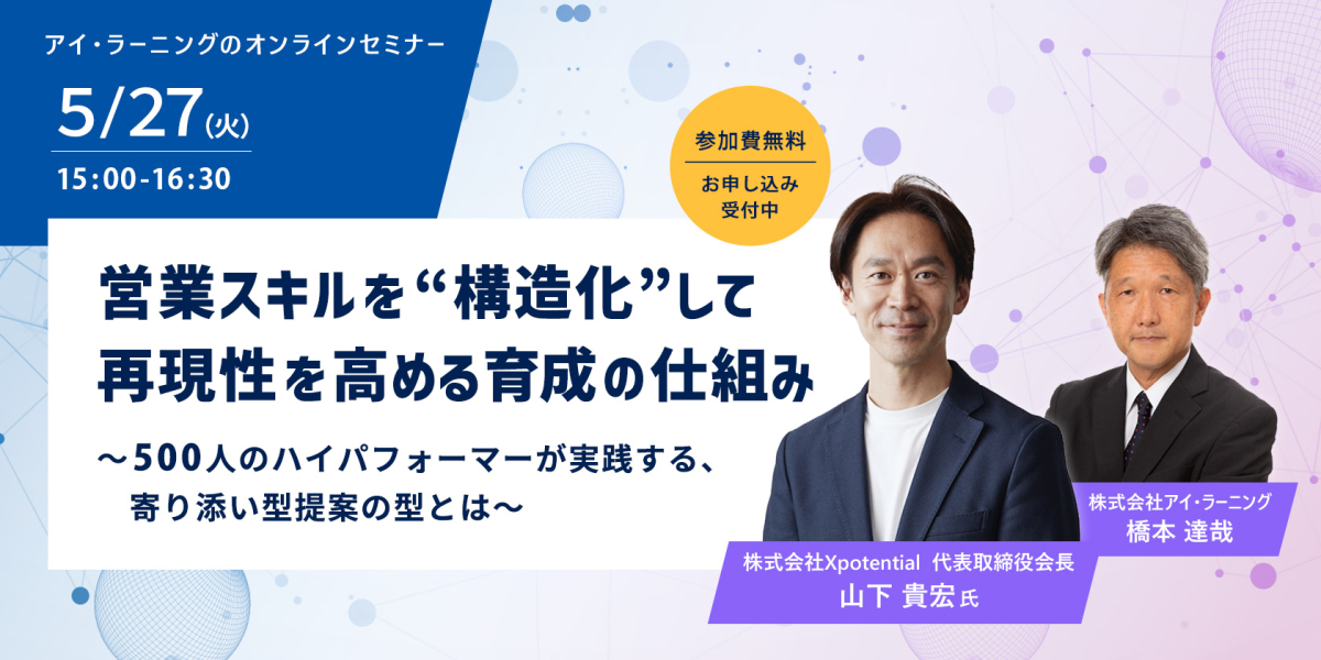 | セミナー | 営業スキルを“構造化”して再現性を高める育成の仕組み 〜500人のハイパフォーマーが実践する、寄り添い型提案の型とは〜 |