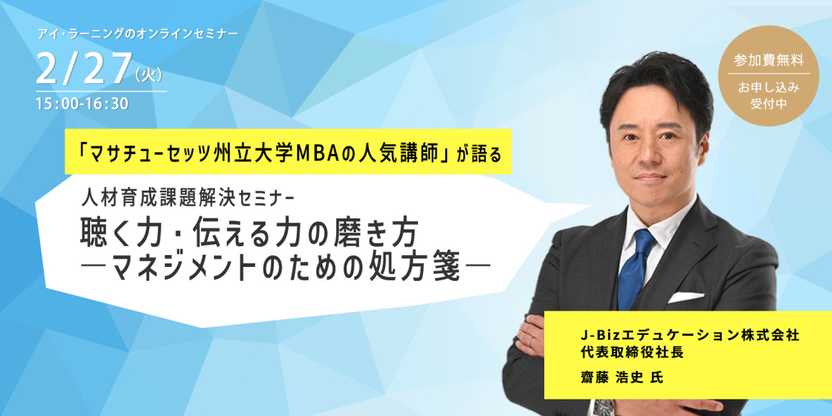 本セミナーでは、マサチューセッツ州立大学MBAの講師であり、次世代のマネジメント育成に情熱を注ぐ齋藤 浩史氏をお迎えします。豊富な経験から現代のマネジメントが身につけるべきコミュニケーション能力についてお伝えします。