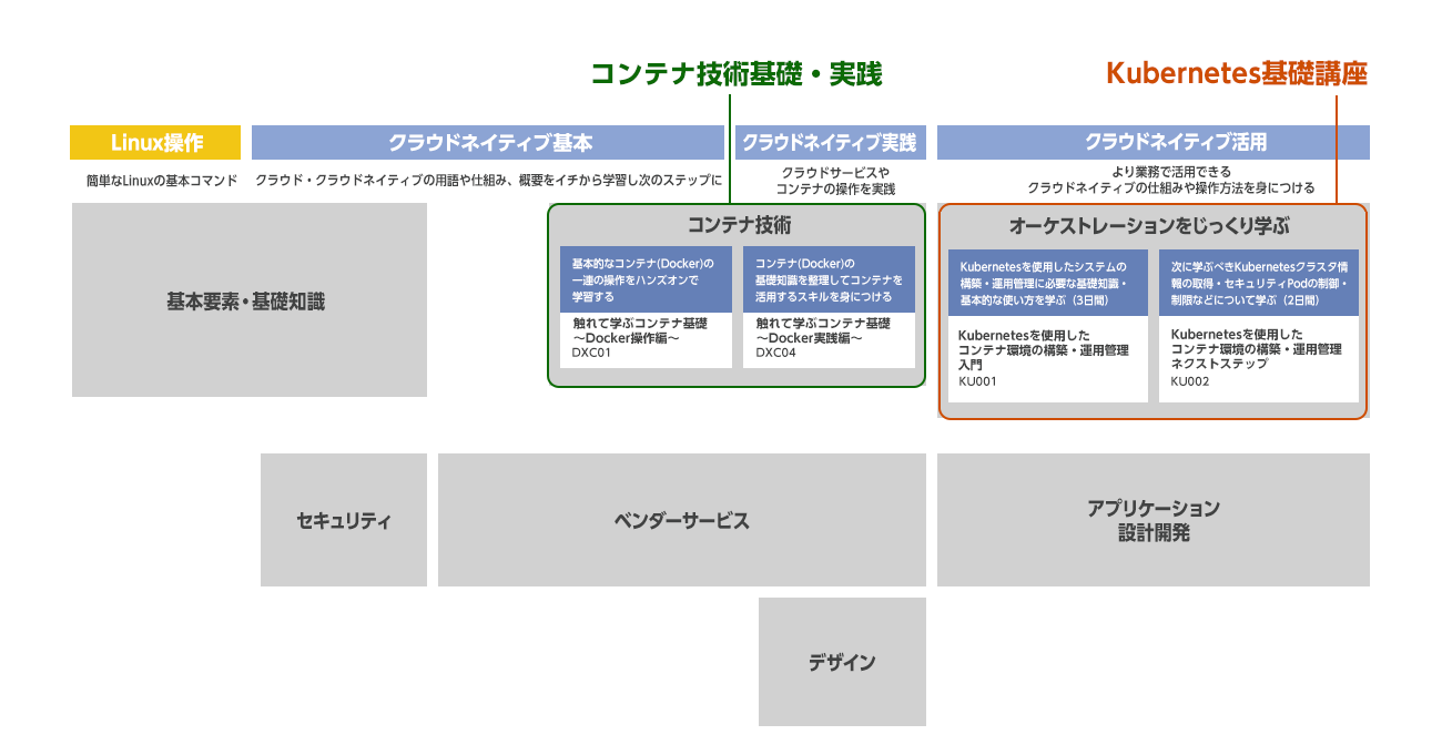 今回ご紹介している「コンテナ技術基礎・実践」「Kubernetes基礎」はクラウド研修の一部です。