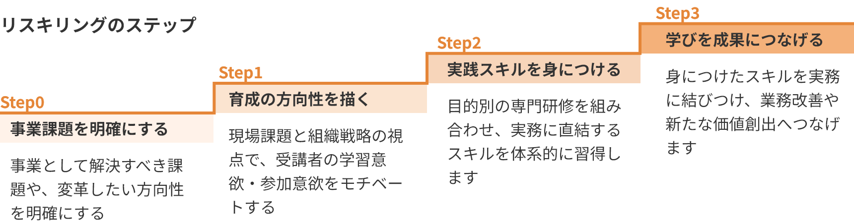 リスキリングは、単に研修を実施するだけでは成果につながりません。事業課題と人材育成を結びつけ、組織の育成施策として計画的に進めることで、初めて「事業成果」として実を結びます。